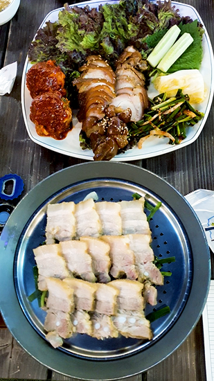 요게 바로 보쌈 수육인데요, 밑에 부추가 깔려있고 찜기라고 해야 되나? 찜통이라고 해야 되나... 어쨌든 그 위에 세팅이 되어서 나오고 두께도 너무 얇지 않은 게 정말 좋았어요 그리고 야장인데 보쌈 저러면 다 식는 거 아니야? 라고 생각하실 수도 있는데